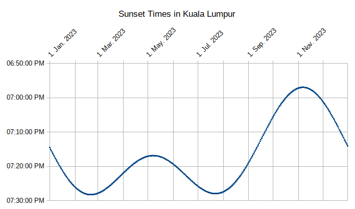 Welcome! Here are the calculated sunrise and sunset times for Kuala Lumpur (3.13°N, 101.68°E). The data variation is minimal year-to-year, making these charts generally applicable every year.